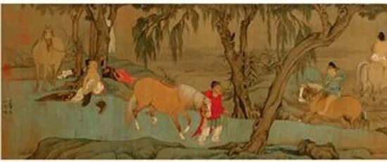 《浴马图》中,数匹骏马分别伫立、静卧、饮水于岸边或水中。溪流舒缓无波,堤岸平广宽直,几位牧马人或坐于池畔乘凉,或在水中浴马,呈现一派怡然自得的景象。