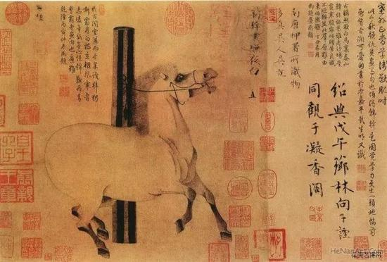 韩干画马,必考时、日、面、方位,然后定形骨、毛色,并结合自己的心得将马加以夸张,形成造型独特的“韩干马”。