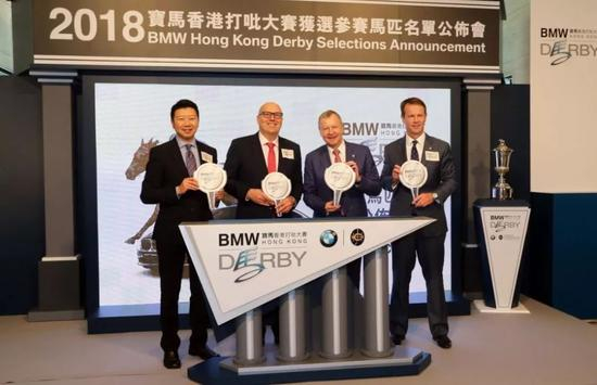香港赛马会行政总裁应家柏先生(右二)、赛马事务执行总监夏定安先生(右一)联同宝马集团香港、澳门及台湾进口业务部副总裁孔楷文先生(左二)及宝马汽车(香港)有限公司香港及澳门区董事总经理刘家辉先生(左一),一同出席记者招待会,并主持仪式公布2018宝马香港打吡大赛入选参赛马匹名单。