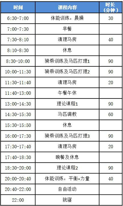项目将根据委培单位用人需求和名额,筛选一批具有优秀的语言表达能力和运动学习能力的适合职业马术教练职业的大学生学员,在全封闭、准军事化管理下,通过在职业马术教练工作实景中为期8周共计540课时的骑乘训练、马房工作实操、马术教学实践性学习及常用理论知识学习,短期内集中、高效的培训出具备马术育人理念、合格的骑乘技能、规范的工作行为习惯、科学的马术教学能力的新型初级职业马术教练。