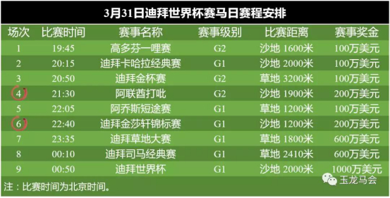比赛日当天将有9场比赛,玉龙马业的两匹赛驹将分别参加第4和第6场比赛 。“玉龙勇者(Yulong Warrior)”将参加第4场阿联酋打吡;“玉龙公子(Wild Dude)”将参加第6场迪拜金莎轩锦标赛。(如下图所示)