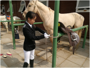 考试分为三部分,除了理论知识的考核,还有马房实操和骑乘测试的“实战考验”。在马房实操的考试中,小骑手们根据考试题目,一丝不苟地进行着对马匹的按摩、刷毛等基础马房工作。