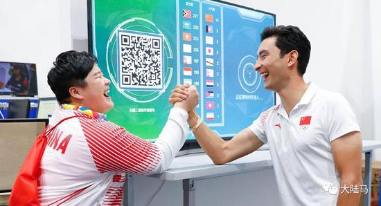 8月27日,新华社发出一张巩立姣和华天比赛掰手腕的照片。 当日,本届亚运会女子铅球冠军巩立姣和马术个人三项赛铜牌获得者华天同时做客新华社亚运会雅加达发稿中心,并在这里进行了一场“力量对决”。
