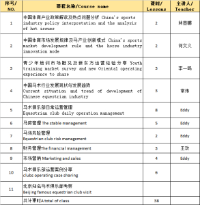 培训班为期6天,包括5天课程培训和1天北京知名马术俱乐部的考察。培训课程包括体育产业、青少年教育行业及马术行业发展概况、俱乐部运营基础实务、马术俱乐部专业管理实务、优秀马术俱乐部(创办者)经营案例分享。