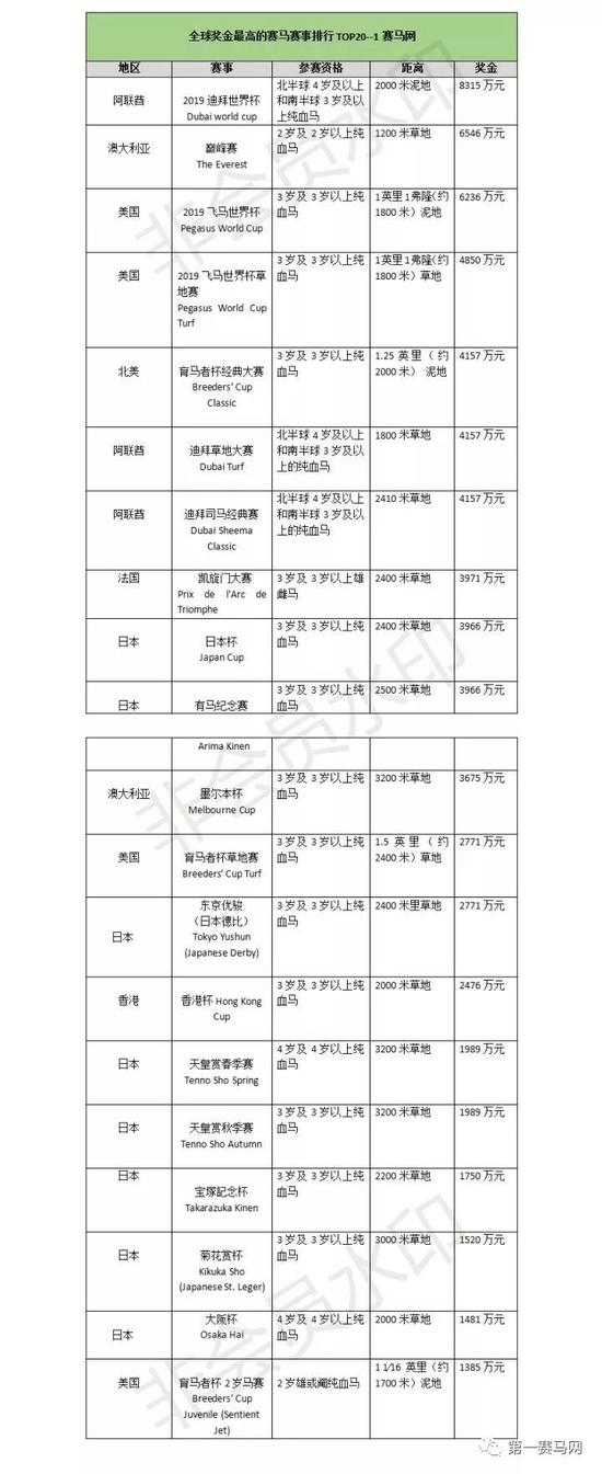 伴随着现代赛马的发展,在世界各地形成了众多享有盛誉的赛事。夺冠的荣誉感和丰厚的奖金是吸引一代代马友投身马业的主要动力。一马君今天就来盘点下世界上奖金最高的20大赛马赛事。
