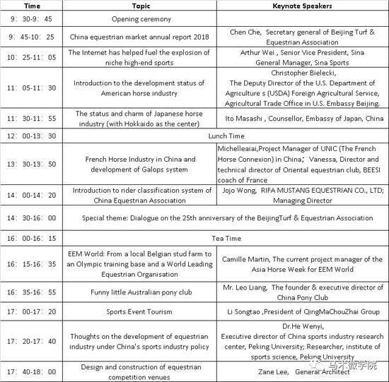 现将演讲嘉宾阵容揭晓:演讲嘉宾有北京马术协会秘书长陈彻先生(演讲主题是2018中国马术市场发展状况报告),新浪网高级副总裁、新浪体育总经理魏江雷先生(演讲主题是互联网助推小众高端运动爆发),日发牧马堂马术发展有限公司 董事总经理王 JOJO女士(演讲主题是中国马术协会骑手分级体系介绍),美国大使馆农业贸易处副主任Christopher Bielecki 中文名博朗克先生(演讲主题是美国马业发展现状介绍),日本国驻华大使馆参赞伊藤优志先生(演讲主题是日本马产业的状况与魅丽),北京大学中国体育产业研究中心执行主任何文义博士(演讲主题是中国体育产业政策下马术行业发展思考),法国国家马业联盟中国代表陈晨女士,东方马汇马术俱乐部主任兼技术总监,法国BEESI级教练Vanessa 女士,青马车寨董事长李松涛先生,澳洲PONY CLUB的中国总代梁景棠先生,马术设计家总建筑师李子欢先生(以上嘉宾演讲主题后附,请见详细介绍)。另外,为庆祝北京马术协会成立25周年,所有的现场到场的嘉宾和观众都将获得北京马协25周年纪念铜章一枚,欢迎大家的到来!
