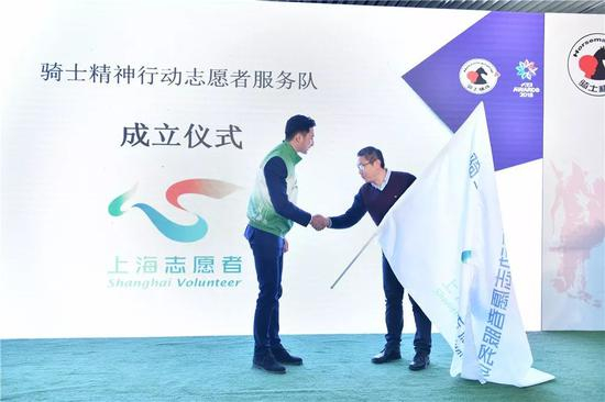 紧接着,上海市志愿者协会信息化与培训部部长张民与华天上台,宣布“骑士精神行动”项目志愿者服务队正式成立,并为志愿者服务队授旗。“骑士精神行动”项目志愿者服务队由华天担任名誉队长,他号召广大青年志愿者、社会各界人士及爱心企业,共同参与到“骑士精神行动”的公益行动中来,凝聚每一份善心和热情,传播爱的温度,“两心合一”,弘扬中华体育精神,带动更多青少年了解和参与马术运动。