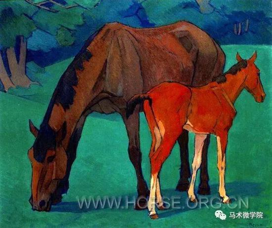 罗伯特·贝文(Robert Bevan)画马深受雷诺阿的影响,又有梵高式的笔触。在他之前,这种体积感和大面积的颜色只被用于风景和人物画。在《母马与小马驹》中,贝文使用了与现实不符的美丽暗色调,马的身体结构很准确,但是以一种最简约的方式呈现,草地与树林也画得十分精确,包括阳光照射留下的影子。