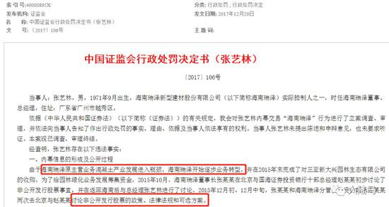 ▲中国证监会行政处罚决定书(张艺林)2017年10月,海南瑞泽发布公告,2016年2月,海南瑞泽实际控制人之一张艺林涉嫌内幕交易海南瑞泽股票,证监会对张艺林处以60万元罚款。