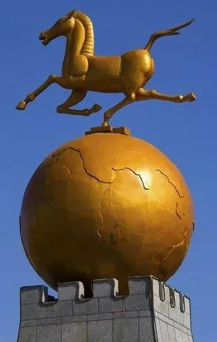 以长城烽火台为底座一匹骏马踏着龙雀,在地球上向前奔腾翻滚。这是1983年10月被国家旅游局确定为中国旅游标志的铜奔马,别称马踏飞燕、马超龙雀。也有网友戏称为“立马滚蛋。