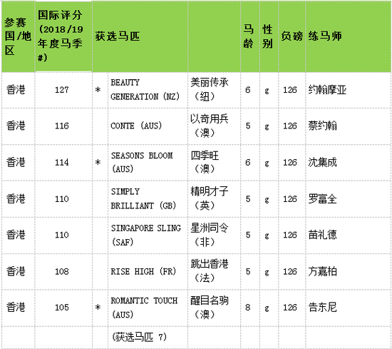 注 :截至2019年4月10日 *曾胜出国际一级赛的马匹 # 8月1日至4月10日 g - 阉马; c/h - 雄马; f/m - 雌马