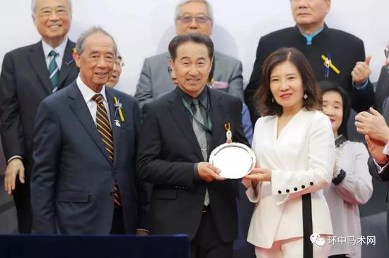 富卫集团董事会主席夏佳理先生(左),大紫荆勋贤CVO GBS OBE JP及富卫人寿保险(百慕达)有限公司营业总监侯玉晶女士(右二)致送纪念品予练马师畠山吉宏