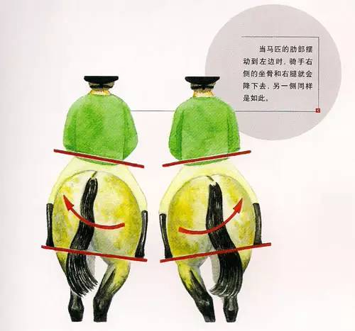 当你骑在马背上时,你能感觉马匹肋部随着后肢的踏进而左右摇摆,体会当马匹的肋部摇到右侧时,你左侧的坐骨和左腿是不是会往下?