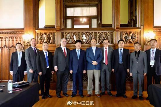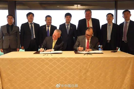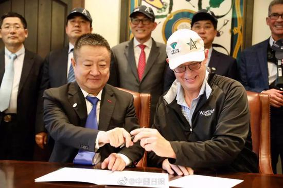 伊泰大漠马业副董事长、2018内蒙古民营企业排名第一的伊泰集团董事长张东海代表伊泰大漠马业与美国赢星育马场签署合作备忘录,图:《中国日报》微博