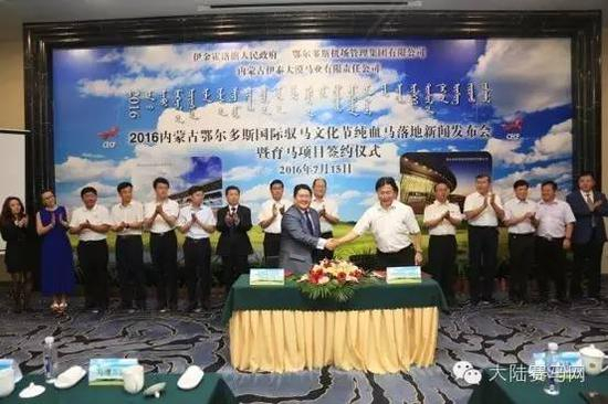 图:《中国日报》微博内蒙古是目前国内马业氛围和马产业资源最为丰富的省份之一,鄂尔多斯近几年积极促进马产业的发展所获成就有目共睹;美国是现代马产业非常发达的国家之一,而肯塔基州的马产业则在美国有着举足轻重的地位。此次,内蒙古鄂尔多斯伊泰大漠马业分别与美国肯塔基坚兰联合公司(Keeneland Association Inc )和赢星育马场(WinStar Farm)签署合作备忘录,将共同开发中国纯血马繁育和训练市场。