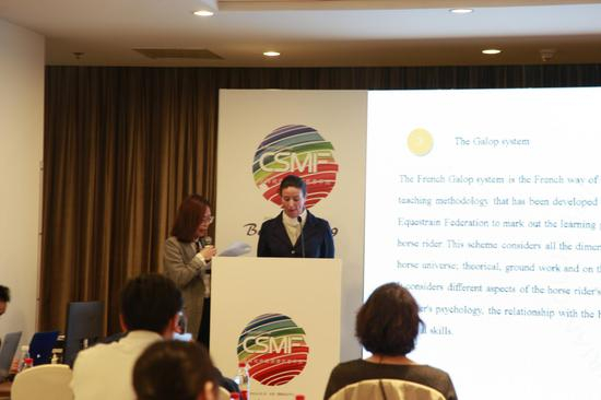 最后,骑缘国际马术俱乐部法籍总教练CC女士在翻译梦婷的帮助下,用英文向到场观众介绍了骑缘国际马术俱乐部。