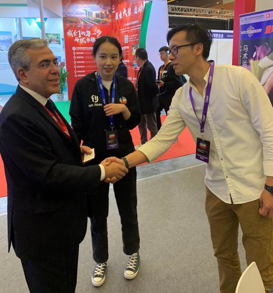 图为北京马术运动协会赛事及商务高级主管、马术教育中心副主任沈明宪先生与阿尔及利亚大使握手并亲切交谈