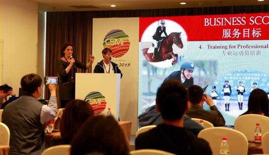 4月30日为2019年中国马术市场发展现状主题分享日,北京马术运动协会赛事及商务高级主管、马术教育中心副主任沈明宪先生、东方马汇马术俱乐部董事长冯宝进先生、东方马汇俱乐部主任Vanessa女士、东方马汇马术俱乐部拓展总监李娜女士、游牧世界运营总监张扬女士、骑缘国际马术俱乐部法籍总教练CC女士等嘉宾先后登台进行了马术相关主题的分享。