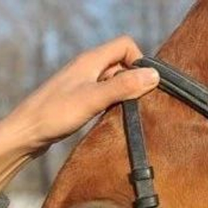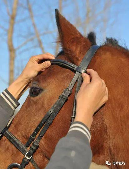 以英式水勒为例,先将上鼻革提到合适的位置——一般是在距离马颧骨一英寸(约2指的宽度)以下的地方。然后,再调整颊革、咽革和其他革带的带扣。