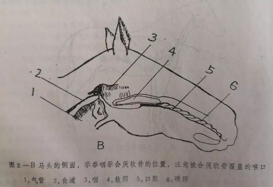 从侧面看,咽的形态略呈现漏斗形,尖端指向喉的会厌。喉以软骨为基础,以韧带相连接,并为喉肌所牵动,通常会厌软骨可有效地分开口腔和咽腔,使空气通畅地进入喉腔。当马匹吞咽时,会厌软骨轻轻地压着喉口,软腭上举,使食物进入咽腔。继之,越过会厌软骨,进入喉口上方的食道口。此时,使马匹通过口腔呼吸也变得非常困难。