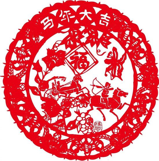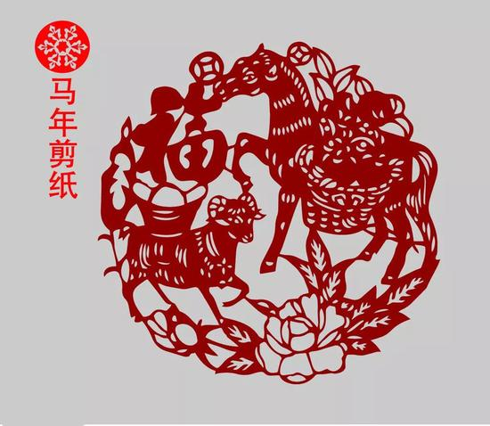 民间剪纸的图案,采用的都是中国民俗吉祥图案,都具有吉利、祥瑞或驱邪等信仰功能。民间吉祥图案,有时还以年画等其他形式表现出来。以马为题材的有《八骏图》、《马上平安》、《马上封侯》等。
