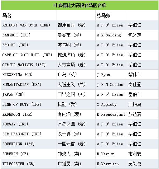 据第一赛马网获悉,6月1日星期六晚上,叶森德比大赛日将在英国叶森马场激情开赛。主办方近日公布了焦点赛叶森德比大赛(2405米一级赛,供三岁雄马及雌马竞逐)的报名马匹名单,截至目前共有15匹赛驹报争。