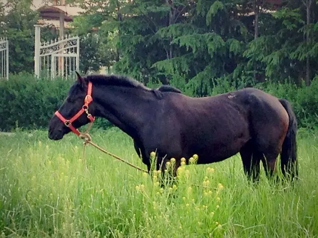 园子里共有两匹马,一匹棕色一匹黑色。第一次见她们的时候,她们刚锻炼完,正躺在沙子上慵懒的晒太阳,听说过驴打滚,还是第一次见到马儿在沙地里打滚哩!