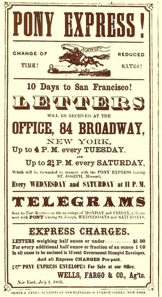 当年,由于驿站数目足够,传送速度相当迅速,由西至东岸,十天内已能送达,现在我们用通讯软件传消息,虽然不用半秒已能送至地球彼方,但在甚么电子、机械、科技都没有的年代,十天已是相当理想,就连那时公司的宣传海报,也是以此作为卖点。