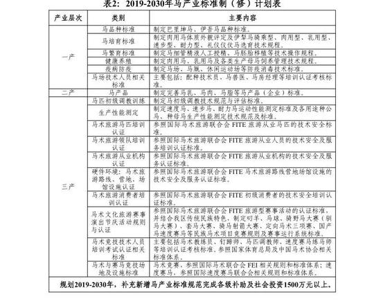 ——预期目标。2019-2030年,计划制(修)定马产业一二三产主要标准规范90余项。建成新疆马繁殖育种、健康养殖、疫病防控、产品加工、调教训练与性能测定、品种登记管理、场地建设、赛马赛事、文化教育、旅游服务等标准化体系,加大标准实施力度,促进马产业规范、合理发展。