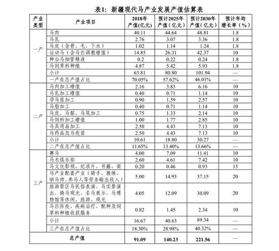 ——预期目标。到2025年,打造形成3-5个全国知名的马文化旅游观光基地,不断扩展马产品及马元素旅游商品开发,形成产业带动作用;打造形成2-3个关注度较高的马产业电视专栏节目或新媒体平台,形成新疆马文化旅游对外宣传的高地。到2030 年,一二三产融合发展的“三园”全面建成投入使用;以特色品牌为核心、主体功能鲜明的“六镇”建成,形成明显带动效应,年参与马文化旅游人数达到疆内旅游总人数3%以上,马术俱乐部会员超过3万人。