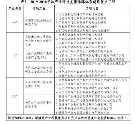 ——主要措施。措施1:支持农业院校和科研院所建立马属动物重点实验室、马生物工程技术中心、马产业研究院,开展马 产业前沿技术研究,攻克新疆现代马产业发展的技术瓶颈。措施2:破解专门化良种培育、运动马调教训练与性能测定、分级分类赛事体系建设与管理、专用饲料加工、疫病防控、马生物制品 加工、产品市场开发和产业链组织模式建立等关键技术;研究马产品在食品、化工、医药等其他领域的应用,开发相关精深加工产品。措施3:采用产业部门推广和“互联网”推广并举的形式,探索马产业科技转化和技术推广的新思路,新方法。建立马产业科技转化平台和马产业技术推广平台,加快马产业科技技术推广实施。措施4:依托马产业科技转化平台和马产业技术推广平台, 积极开展技术人才培训,形成马产业人才培养平台。