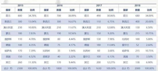 统计显示,2018年荷兰是向中国出口马匹最多的国家,2017年7-8月近两个月时间由于疫情暂停贸易造成该年度出口量减少,而2018年出口排名第一。德国曾在2017年出口数量快速增加,2018年却因为疫情和修改条款暂停贸易的影响,出口数量严重萎缩。随着国家一带一路政策的逐步推进,蒙古国和哈萨克斯坦的出口数量在逐年增加。