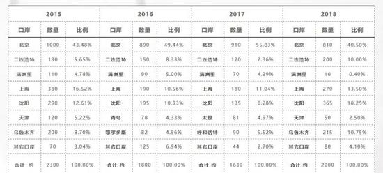 统计显示,2018年北京、沈阳、上海依然为主要进口口岸,因内蒙古莱德马业的进口数量增加直接影响沈阳进口量超过上海,排名第二。受国家“一带一路”倡议影响,二连浩特和乌鲁木齐这两个内陆陆运口岸有较大的增加。