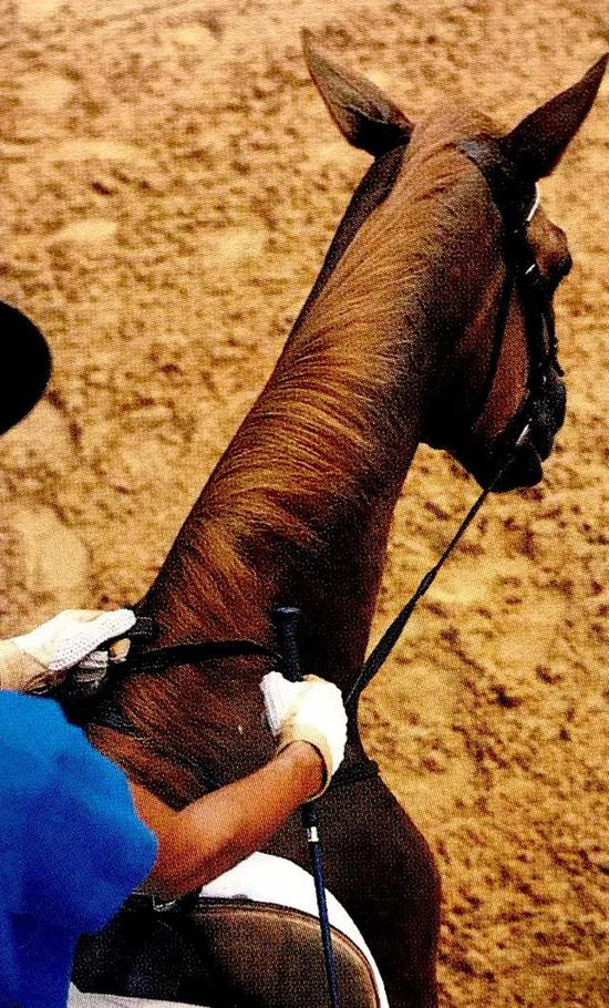 如果马没有回应你的转向示意,或弯曲不够充分,颈上控缰就会十分有效。不要向后拉缰绳,只要将持缰的双手放到你希望马转向的一侧,再回到正常位置。这会对马的颈部和嘴轻轻施压,鼓励它转向。
