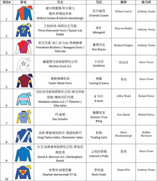 由“加勒比海之珠“项目主开发商(DSH大漠加勒比海之星有限公司)冠名赞助的圣卢巅峰杯自公开宣传以来,收获了众多业界领袖的大力支持,圣卢巅峰杯的十个闸位出赛马主及团体分别来自北美、加勒比海和大洋洲,其中包括史蒂芬·纳里尼塞(Stephan Narinesingh Et Al。)、企业家丹·谢弗(Dan Schafer)、赢星育马场(WinStar Farm)、泰勒梅德牧场与合作伙伴(Taylor Made Farm and partners)、威尔弗雷德·阿卡姆与梅林·萨姆拉辛格(Wilfred Acham & Merlin Samlalsingh)、练马师柏多迪(Todd Pletcher)、精英马匹代理与索尔·库敏的马达克马房(Elite Sales & Sol Kumin’s Madaket Stables)、新门育马场(Newgate Farm)、菲文兄弟与特柳赖德代理(Freedman Brothers Trainings & Telluride Agency)、法西·蒂普顿拍卖行与湛蓝拍卖行(Fasig-Tipton Sales & Bluewater Sales)、罗金厄姆牧场与大卫·伯恩森有限责任公司(Rockingham Ranch & David Bernsen, LLC)以及三钻牧场与莉莉女王马房 (Three Diamonds Farm & Queen Lily Stable) 。