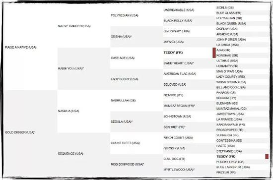 Woodman(USA);Miswaki(USA);Smart Strike‘醒目出击’(USA);Seeking The Gold‘采金’(USA);Fappiano(USA);Forty Niner(USA);Machiavellian‘权谋宗圣’(USA);Gone West(USA);Kingmambo‘金满宝’(USA);Gulch(USA);Fusaichi Pegasus‘灵驹’(USA)