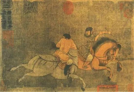 韦偃的《双骑图》是非常难得的佳作。画面上两匹骏马从远处狂奔而来,在主人谈说间各自转向的一刹那,通过此作品我们可以领悟到韦偃在观察马、塑造马以及构图方面的高妙之处。不愧是胸藏万马的大家。