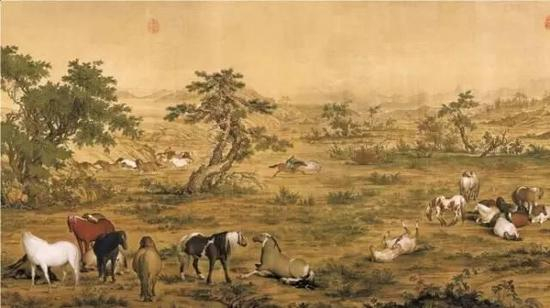 郎世宁(1688—1766)意大利人,清康熙五十四年(1715)到中国,历康、雍、乾三朝,在中国从事绘画达50多年。郎世宁1728年完成的长卷《百骏图》共绘有100匹骏马,姿势各异,或立、或奔、或跪、或卧,可谓曲尽骏马之态。画面的首尾各有牧者数人,控制着整个马群,体现了一种人与自然界其他生物间的和谐关系。