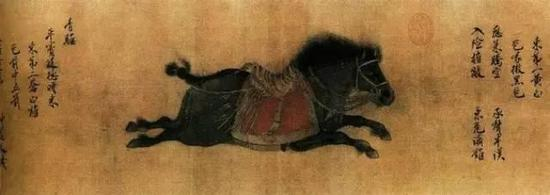 以人物画闻名于世的顾恺之,兼善画马,其传世名作《洛神赋图》中描述了姿态各异的骏马。最难能的是画中一匹四足仰天的马,弧形的脊背、弯曲的四肢、飞扬的尾巴……作者力图表现马在滚尘时一刹那的动姿,能有如此的观察力和表现力是非常可贵的。