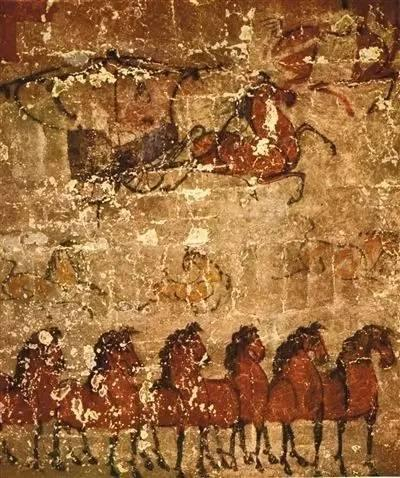 南北朝时代在画马方面具有较高的艺术成就,其主要特点是造型准确,姿态多变,注重刻画马的神态。南齐毛惠远、北齐杨子华是这一时期的代表人物。虽然二人没有作品流传下来,但是我们可以从山西太原壁画《仪卫出行与归来图》领略到这个时期的马画风采。