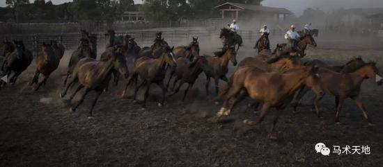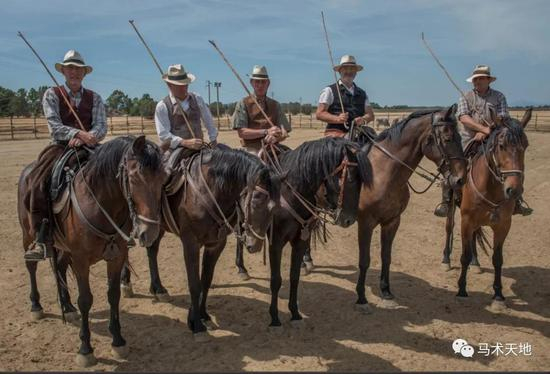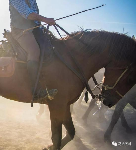同其他牛仔一样,巴特里牛仔也是单手持缰,另一只手拿一根带柄钩的长木棍,称作mazzarella。这就相当于他们的第三只手,用于驱赶牛群和马匹。