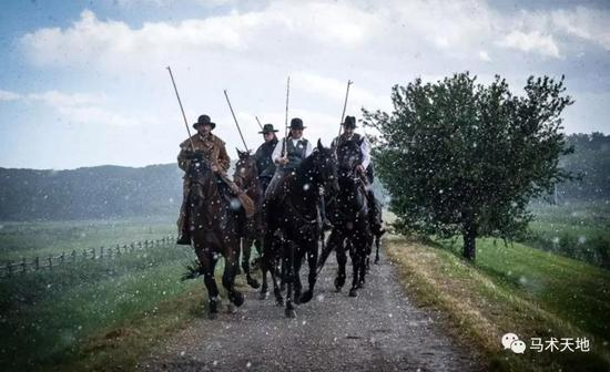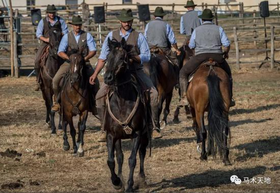 牛仔正在进行传统的多人马术表演,动作复杂,精于配合
