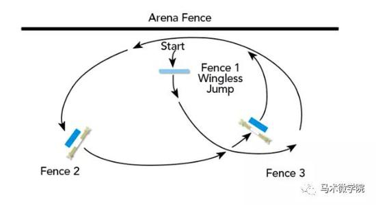 设置:以超过90度的角度摆放两道利物浦障碍(见图中Fence2、3),注意水的位置,不要担心障碍之间的确切距离。在两个利物浦障碍之间的等距离,平行并靠近场地围栏放置一个看起来不太寻常的小型无边围栏(图中Fence1,即Start位置。Arena Fence为大场地围栏)。除了测试回转以外,这是一个很好的测试马匹是否在倾听的训练,因为那个有点怪异的小围栏障碍可能会让你的马马很在意。