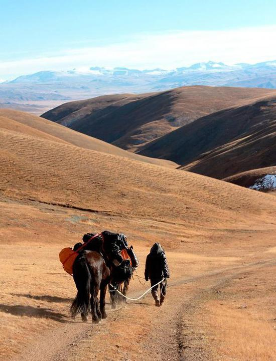 凛冽的风挤过山口飞驰而来,打在我们脸上。我弓身坐着,躲在新买的始祖鸟牌防风衣下面。这件夹克的面罩和风帽替我挡开了严寒,却也让我远离了外部世界。随着有节奏的马步,我在马背上前后摇晃,沉浸在自己的思绪中。卡夫卡倒是因陡峭的爬坡,浑身汗水闪亮。汗水汇成小溪,从它两胁处流下,混杂着尘土、在毛发的末端结成灰色的箭头。