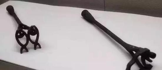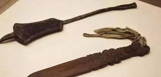 马汗刮子:刮马汗用具。马因跑远路或急驰而出汗,当卸下鞍子时鞍屉下会有很多的汗,如果不及时刮掉,马会受凉生病。马汗刮子一般用竹板或木板制作,其形状像一把带柄的双刃剑,两侧要磨平磨圆,防止刮伤马的皮肤。马汗刮子上刻有各类图案及纹饰。