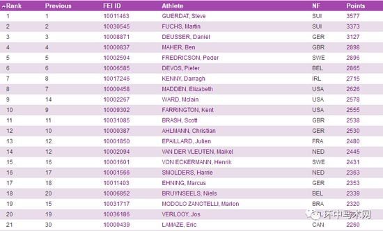国际马联官网更新马术场地障碍骑手世界排名,奥运冠军、瑞士名将史蒂夫·古尔达特(Steve Guerdat)继续位居世界第一。欧锦赛个人冠军马丁·福斯(Martin Fuchs)与世界杯常胜将军丹尼尔·杜瑟(Daniel Deusser)分列二三位。