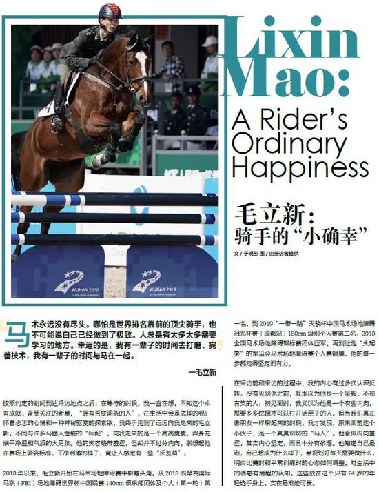 2018年以来,毛立新开始在马术场地障碍赛中崭露头角。从2018浪琴表国际马联(FEI)场地障碍世界杯中国联赛140cm俱乐部团体及个人(第一轮)第一名,到2019“一带一路”天骁杯中国马术场地障碍冠军杯赛(成都站)150cm级别个人赛第二名、2019全国马术场地障碍锦标赛团体亚军,再到让他“火起来”的军运会马术场地障碍赛个人赛铜牌,他的每一步都走得坚定而有力。