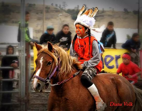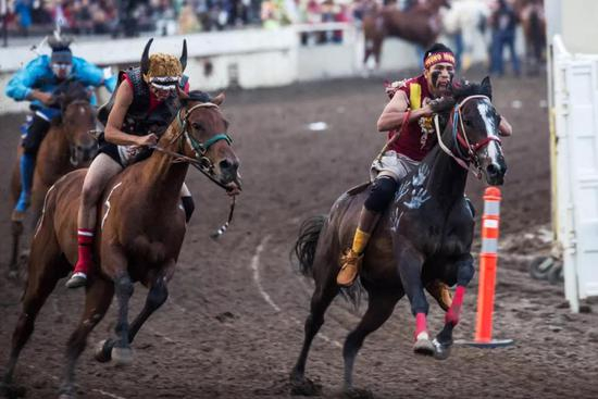 在北美,有一个赛马比赛,要求四名骑手和三匹马配合完成。参赛骑手和马匹穿着绚丽的印第安风格服饰,脸上、身上画着独具印第安特色的彩妆,骣骑骏马飞奔在赛场上。