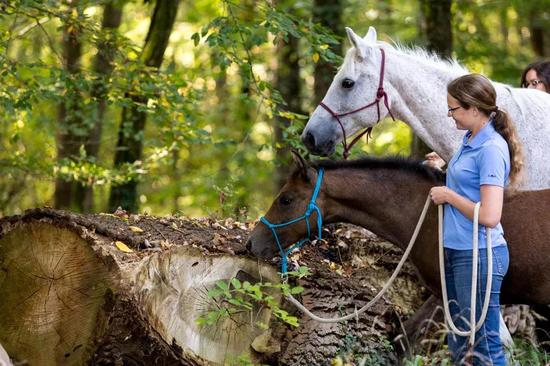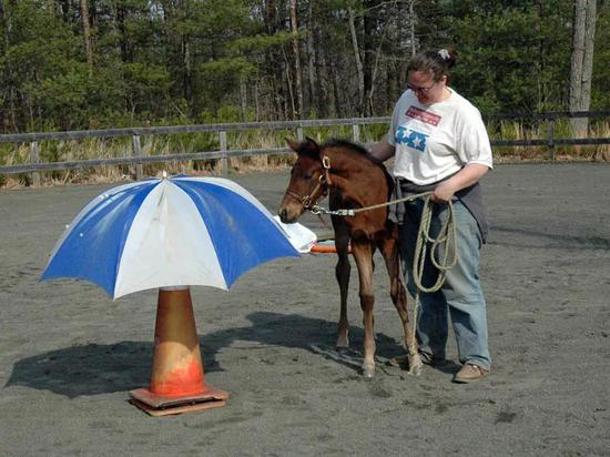 脱敏:进行简单的脱敏训练,多带小马驹到处走走,让他们适应各种环境,如河、树丛、木桩等等;教小马驹上下车,并让它适应车内较为阴暗的环境。