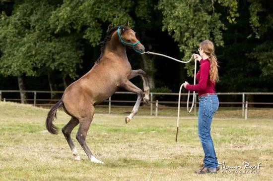 如果骑手在马匹小的时候就赢得他们的尊重,马匹就永远不会认为踢、咬或逃跑是正确的。如果骑手一再地纵容马匹,就不再是自己会不会受伤的问题,而是伤的会多重的问题。
